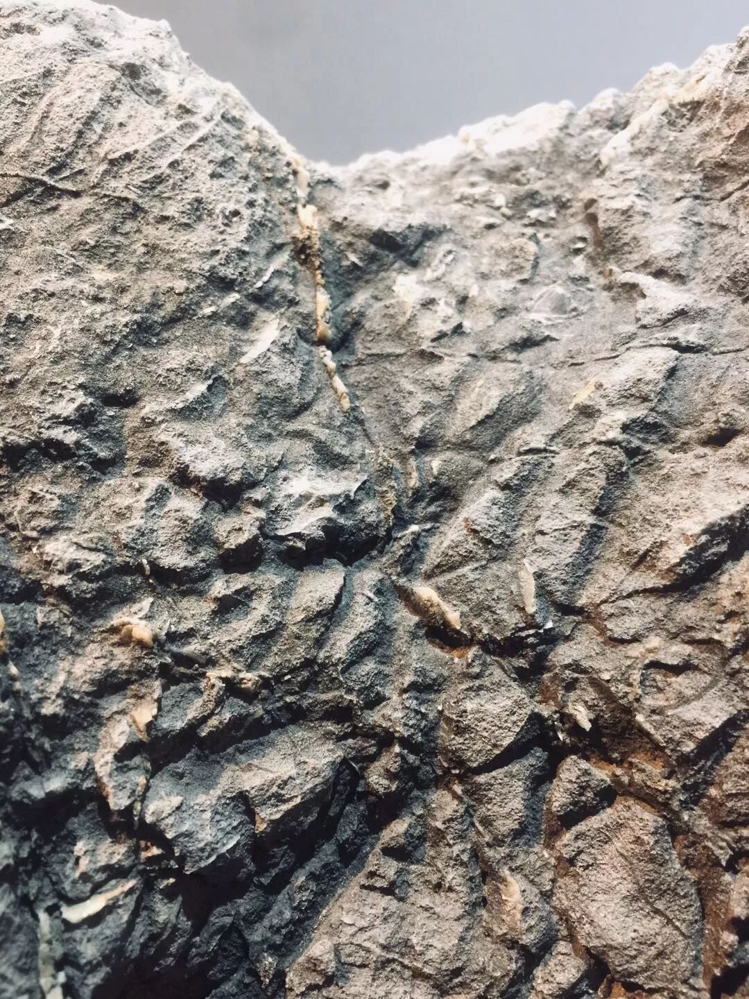 取回这方不为主人所喜的石头,只是简单的清理下灰尘,便安置于案,一座好山便跃然眼前。历经岁月侵蚀、风雨淋洗的老皮壳暗灰而苍白,陈草腐叶之迹满覆其上,经年不褪,手拂不去,原始而又沧桑。身一近前便有一种远古的气息扑面而来,那是一种阅尽了世间繁华,见证了草木枯荣,惯看秋月春风的淡然与从容。